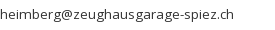 • Zeughaus-Garage AG, Beat Wyssen, Bernstrasse 196, 3627 Heimberg (CH), Tel: 033 439 39 29, Fax: 033 439 39 28, heimberg@zeughausgarage-spiez.ch
