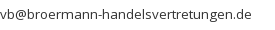 • Broermann Handelsvetretungen Vera & Hendrik Broermann, Siechenkamp 16a, DE-59557 Lippstadt (DE), Tel: +49 2941 80 06 79, Fax: +49 2941 80 06 79, http://www.broermann-handelsvertretungen.de/, vb@broermann-handelsvertretungen.de